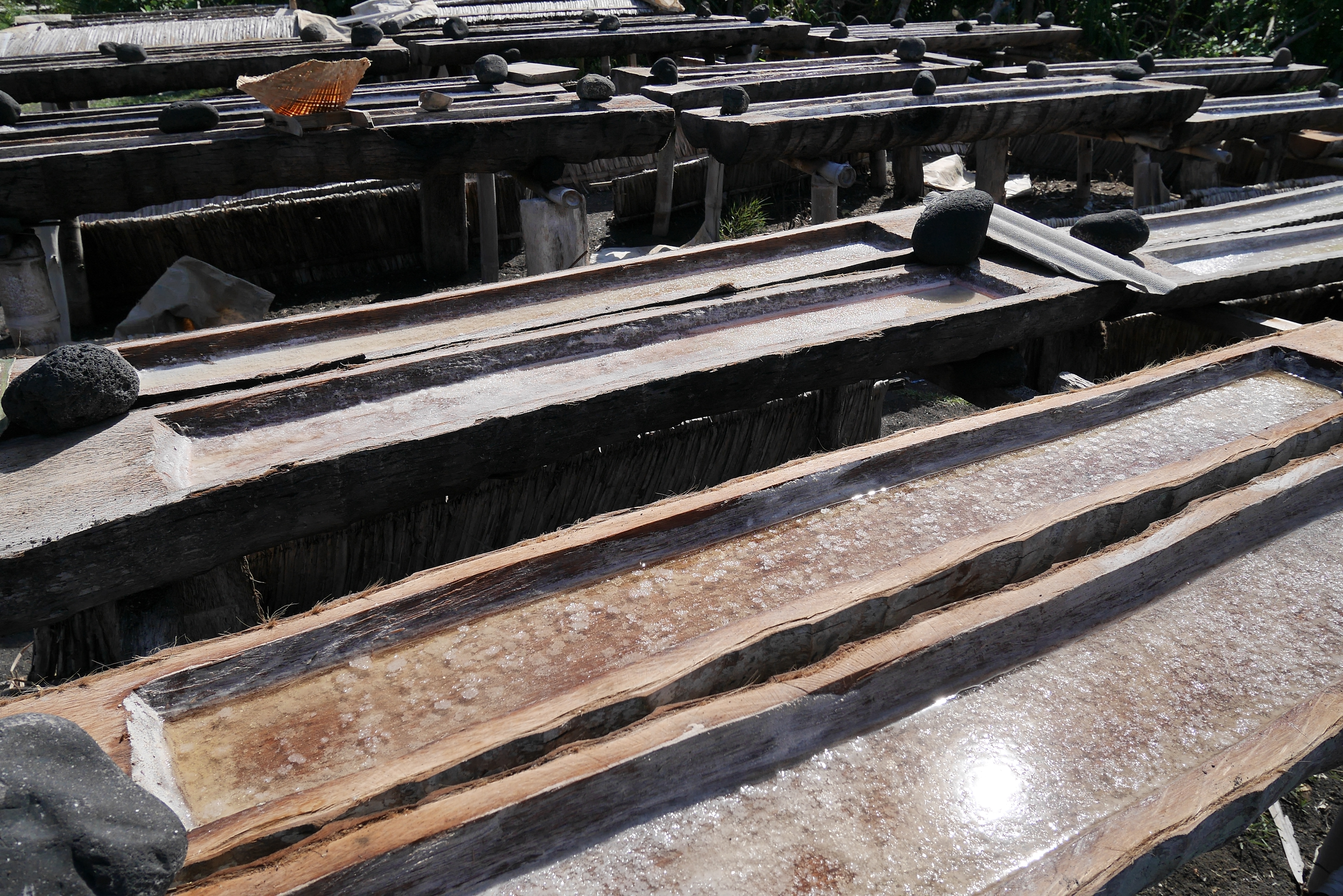 저렇게 바닥에 물을 붓고 소금 모래를 만든후 모래를 다시 씻어서 소금을 만든다는 것 같다.