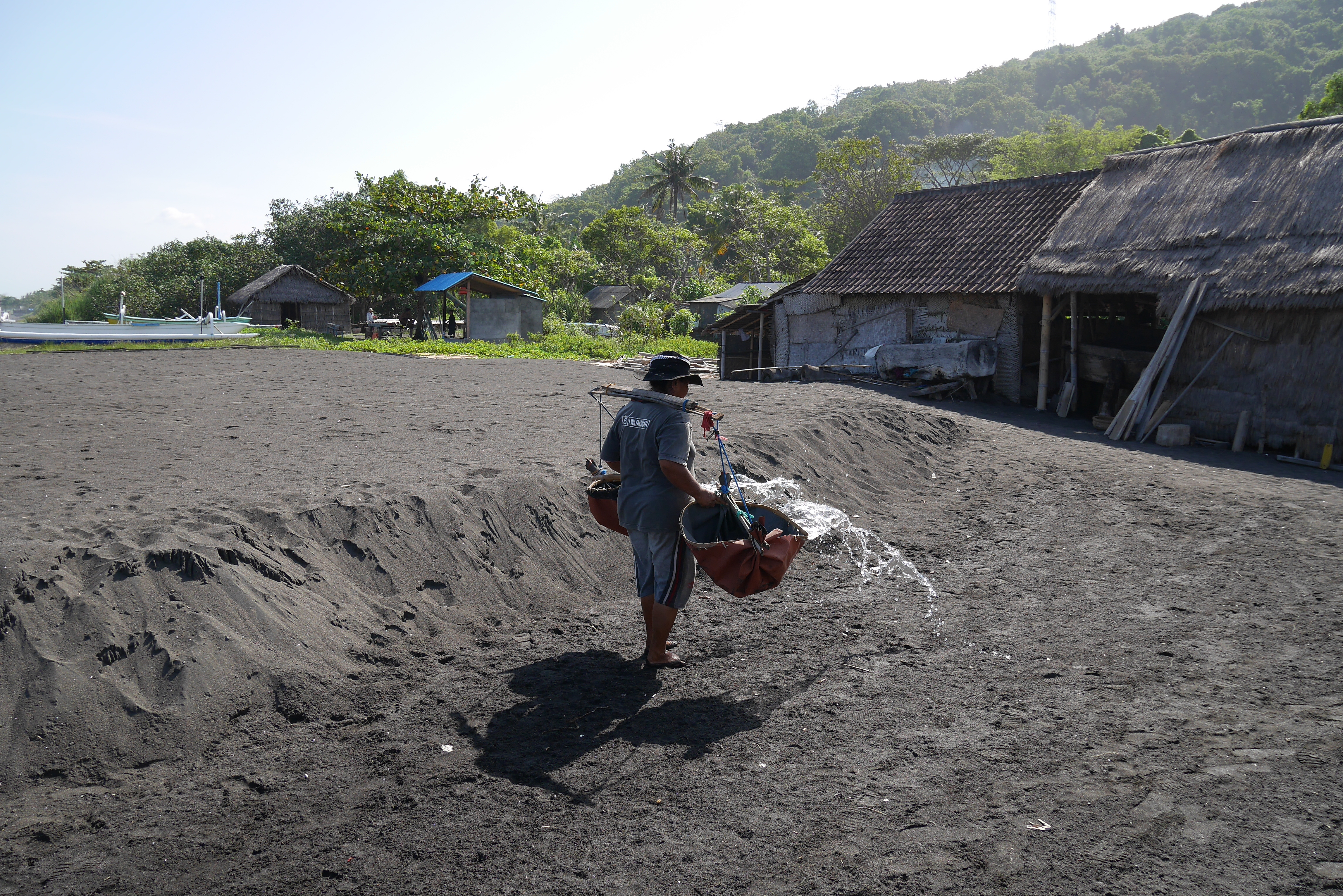 바닷물의 염도가 낮아 일단 염도를 올려야 하고 염도를 올리려면 햇빛 잘 받는 검은 모래에서 증발 시키는게 유리해서 그렇다나 뭐래나.. 기억이 가물가물하다.