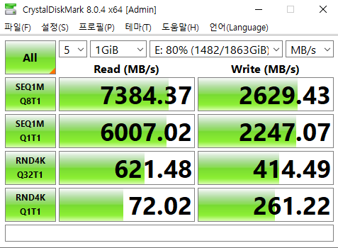 사용공간 80% 때 테스트 했더니 쓰기 속도가 2629 메가 나온다.