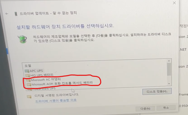 Microsoft AC 어댑터 또는 Microsoft ACPI 호환 컨트롤 메서드 배터리 중 마음에 드는 것으로 설치해주면 된다.