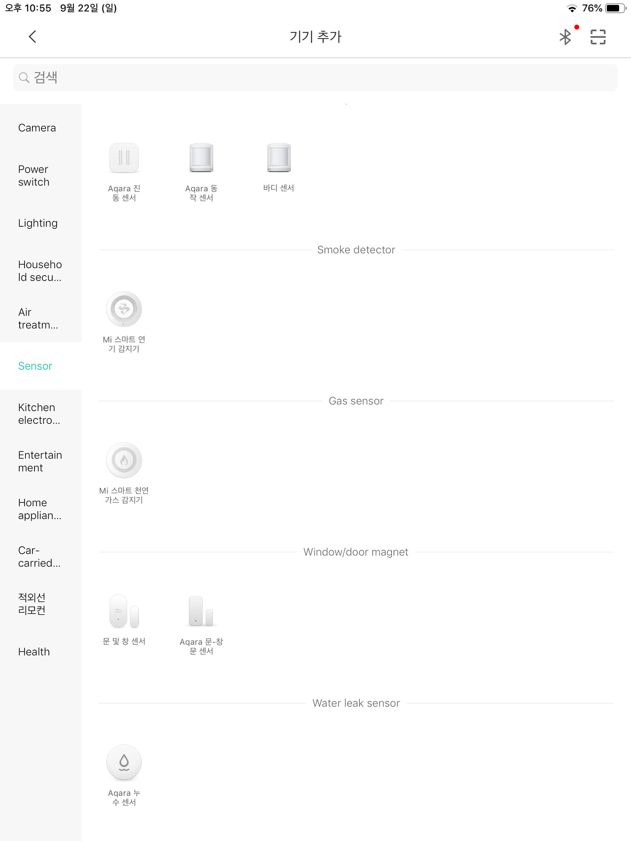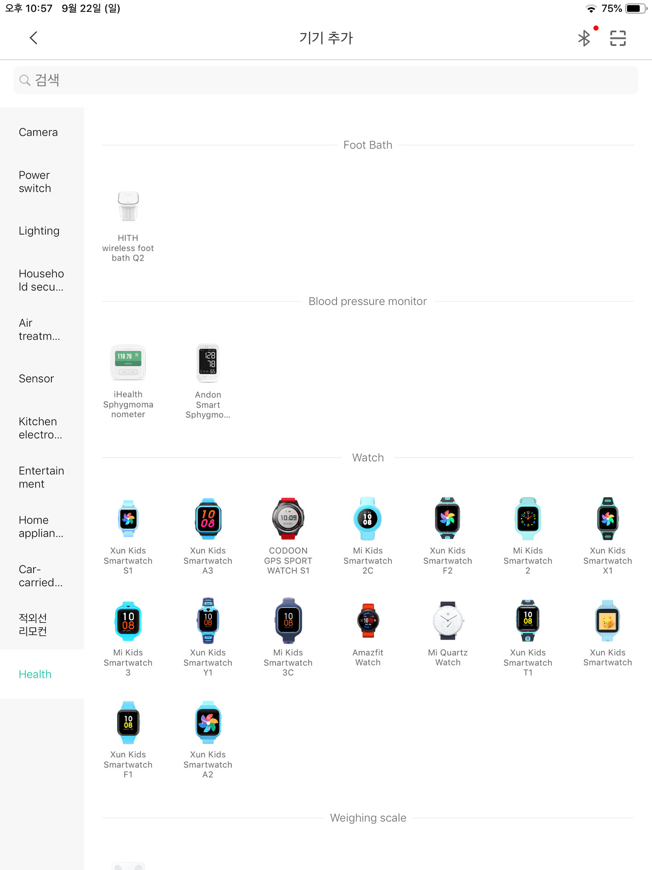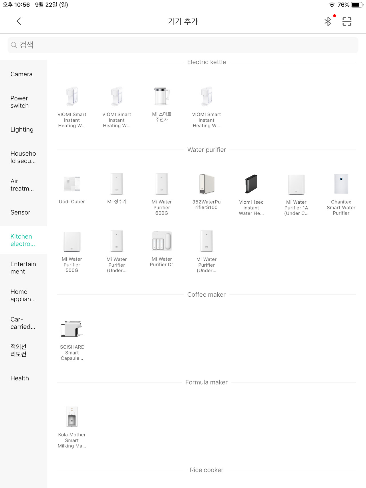 그리고 상단에 기기 추가 버튼은 + 마크를 클릭하면 등록 가능한 모든 기기를 볼 수 있는데 제품명이 한글인 제품도 있고 뭐가 다른지 모르지만 완전히 동일하게 생긴 제품들도 보인다.