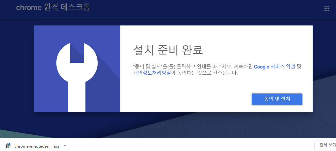 다운로드 완료되면 지켜 보고 있던 크롬 원격 데스크톱이 "동의 및 설치" 하라고 압박한다.