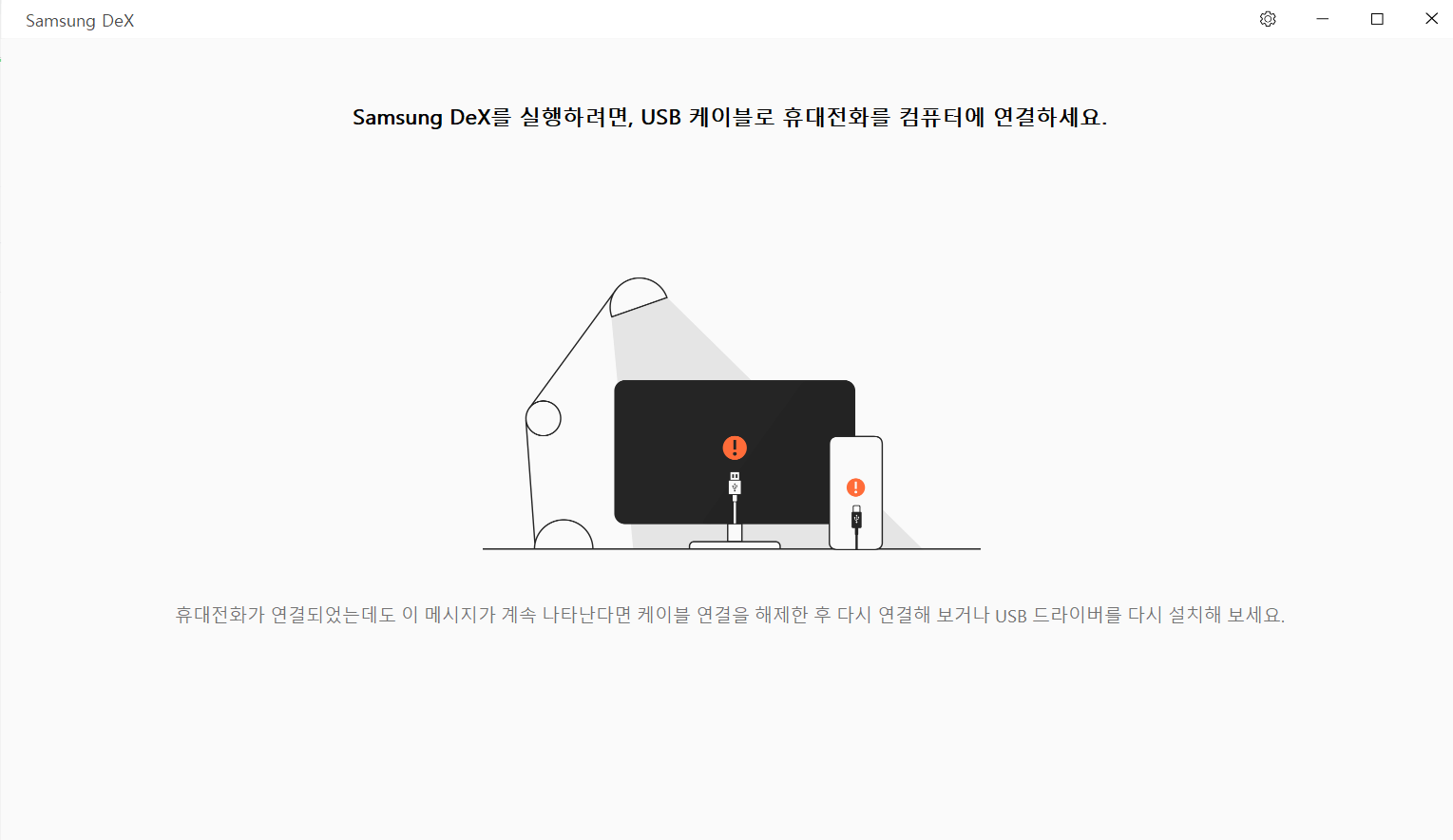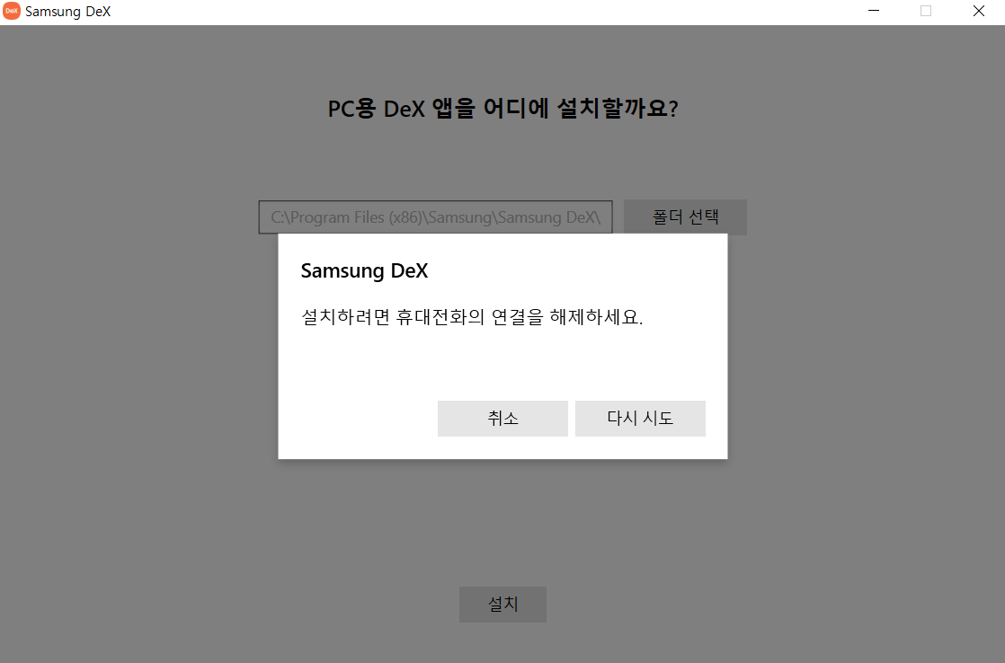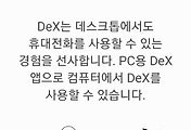 "Ddex는 데스크톱에서도 휴대전화를 사용할 수 있는 경험을 선사합니다. PC용 DeX앱으로 컴퓨터에서 DeX를 사용할 수 있습니다." 라는 메시지가 뜬다.