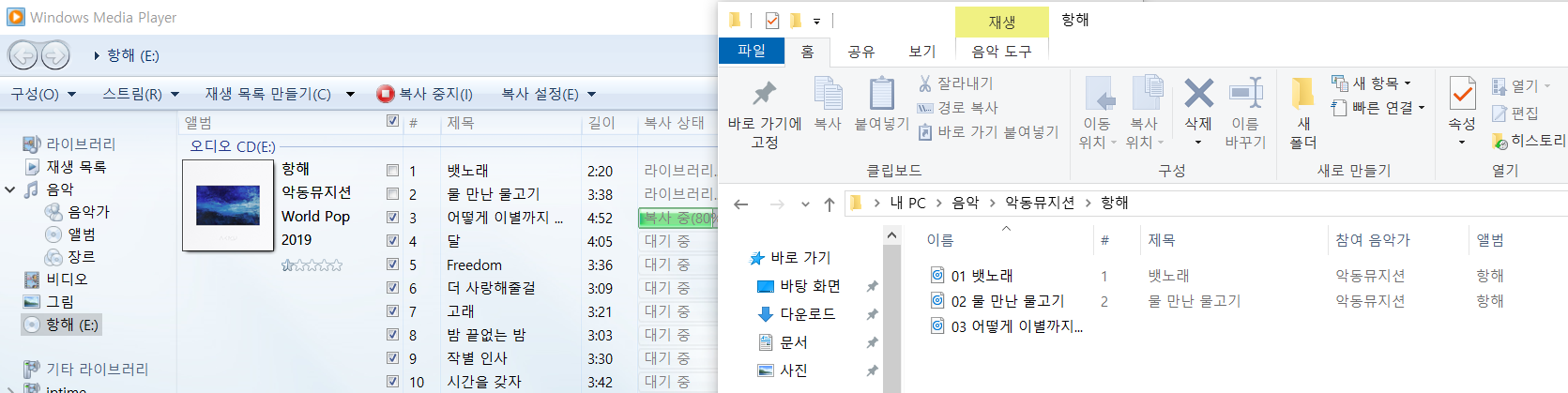 CD 복사 라던 글씨가 복사 중지로 바뀌고 내 PC > 음악 폴더에 악동뮤지션 폴더가 생겼다.