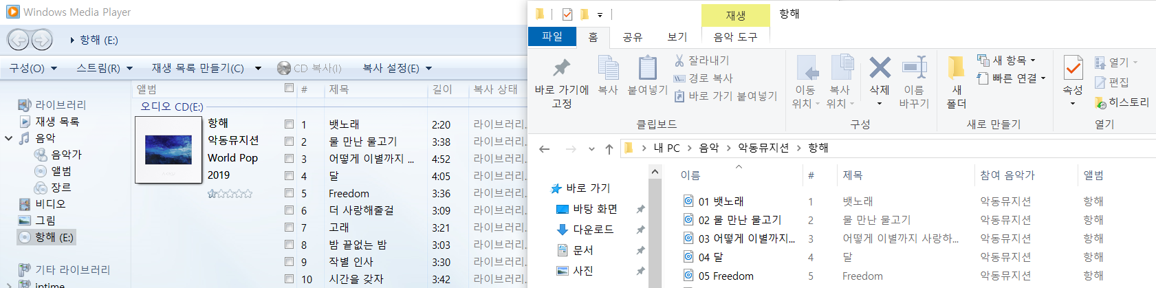 4. 주변을 한번 더 살핀 후 주변에 아무도 없으면 윈도우즈 미디어 플레이어 실행하고 복사 설정에서 음원 320Kbps 로 올리고 CD 복사 버튼을 누르면 이렇게 음악 폴더에 음원이 들어온다. 이름, 제목, 참여 음악가 앨범 정보는 자동으로 들어가짐.