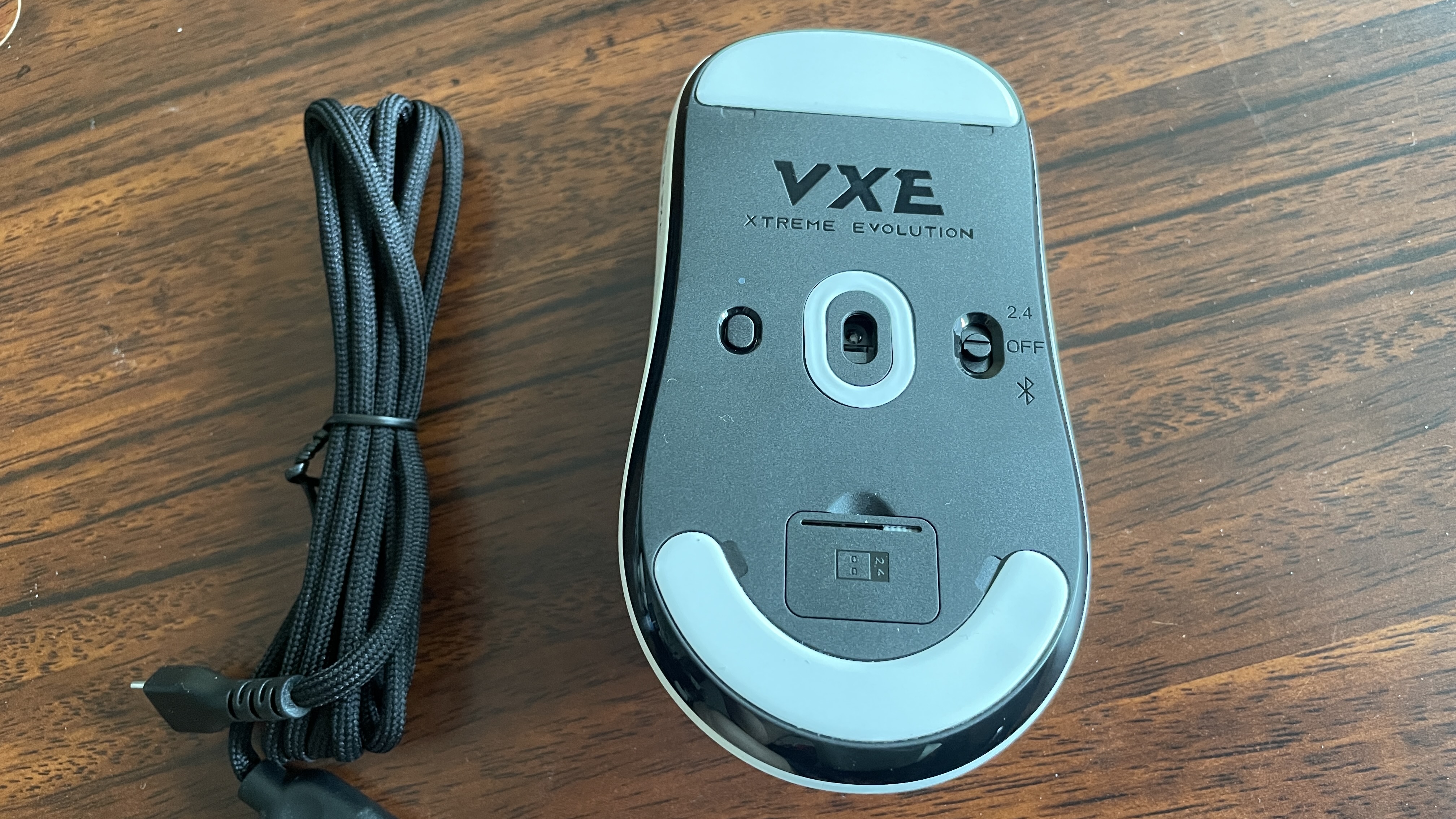 하단 왼쪽에 DPI 조절 버튼과 2.4g, 유선, 블루투스 전환 스위치가 위치해 있다.