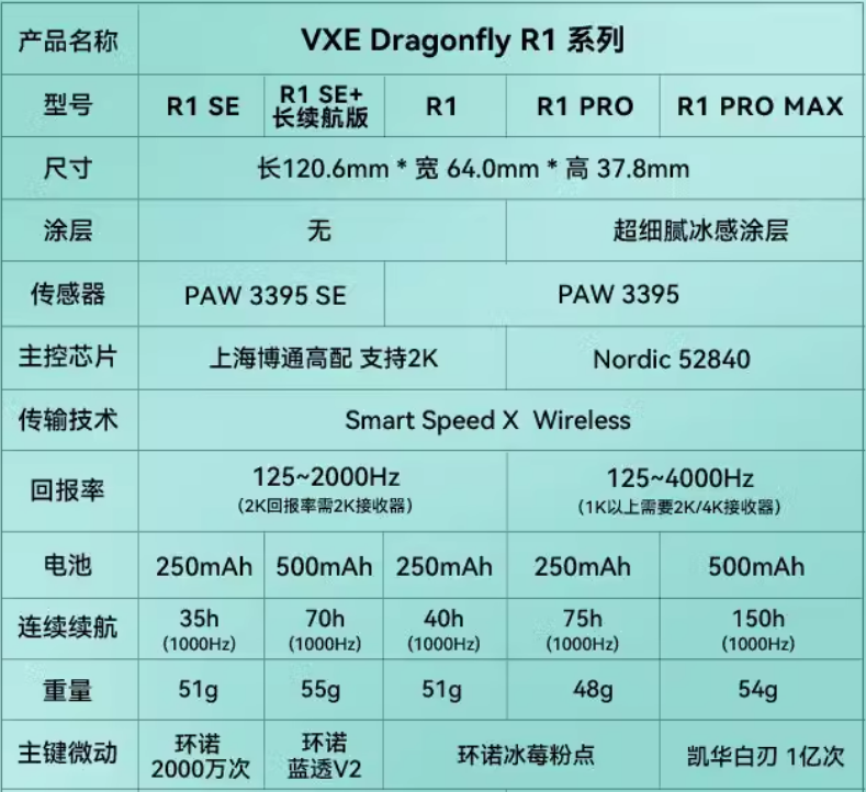 R1 SE 칩셋이 한단계 낮은 제품 , R1 SE PLUS 는 SE에서 배터리 2배로 늘린 제품이며 배터리 사용시간 스펙상 사용시간 70시간이라고 한다., R1 가장 기본인 제품이며 PAW3395 센서 사용으로 소비전력이 낮다 여기까지 블루투스 연결을 지원한다., R1 PRO 처리장치 칩셋 개선으로 4K 급 연산도 가능하다 하지만 전용 수신기가 필요하며 블루투스를 지원하지 안는다. , R1 PRO MAX는 프로와 동일 스펙이며 배터리 용량이 2배로 SE PLUS 와 같이 500mAh 배터리를 사용하며 150시간 사용 가능하다.