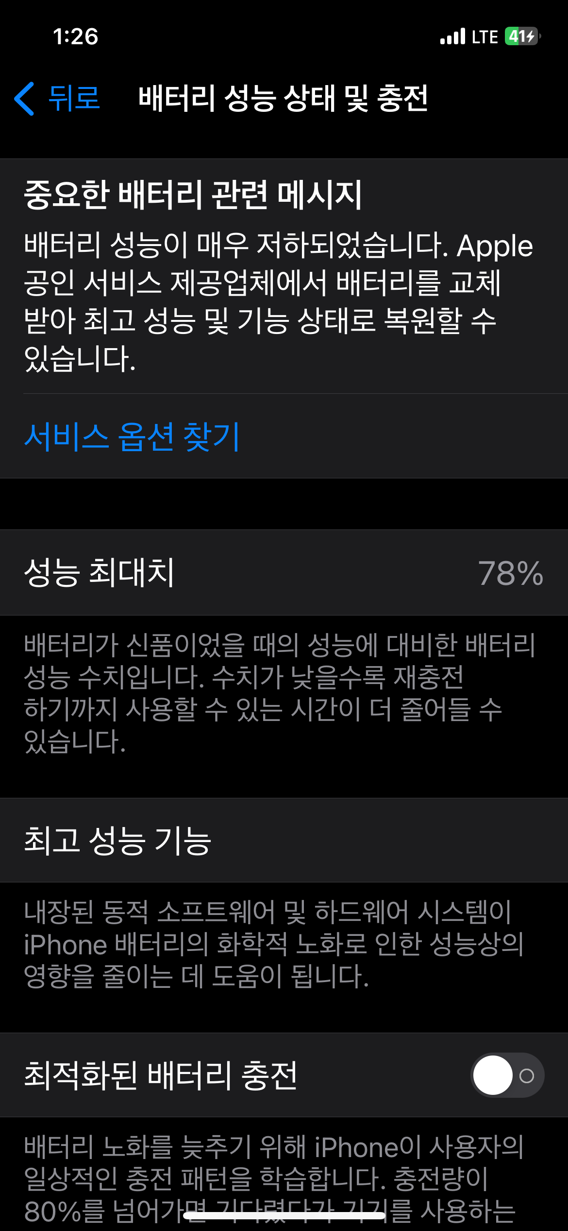 최대성능이 87% 지만 체감 배터리 수명은 100% 일 때의 반정도 밖에 안된다.