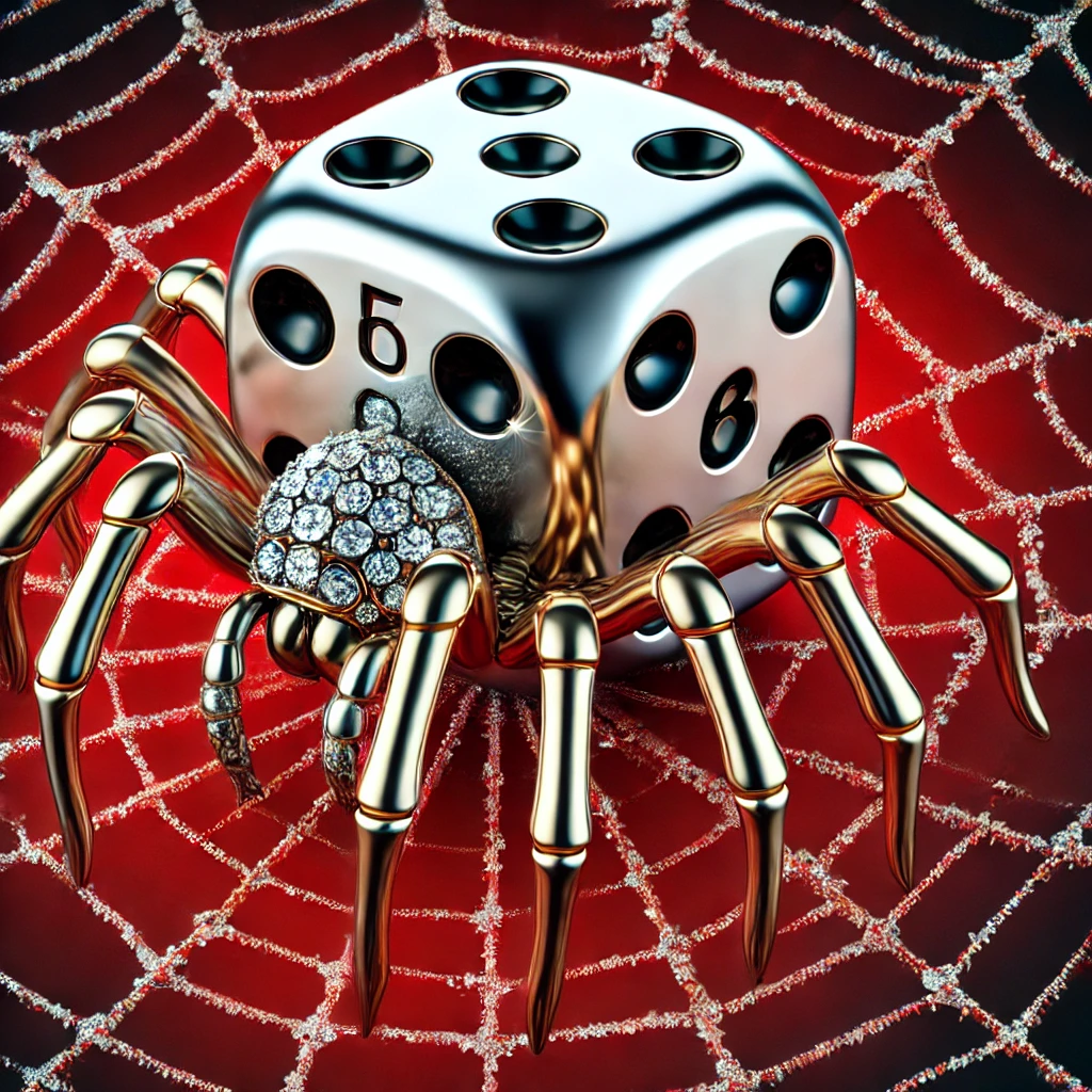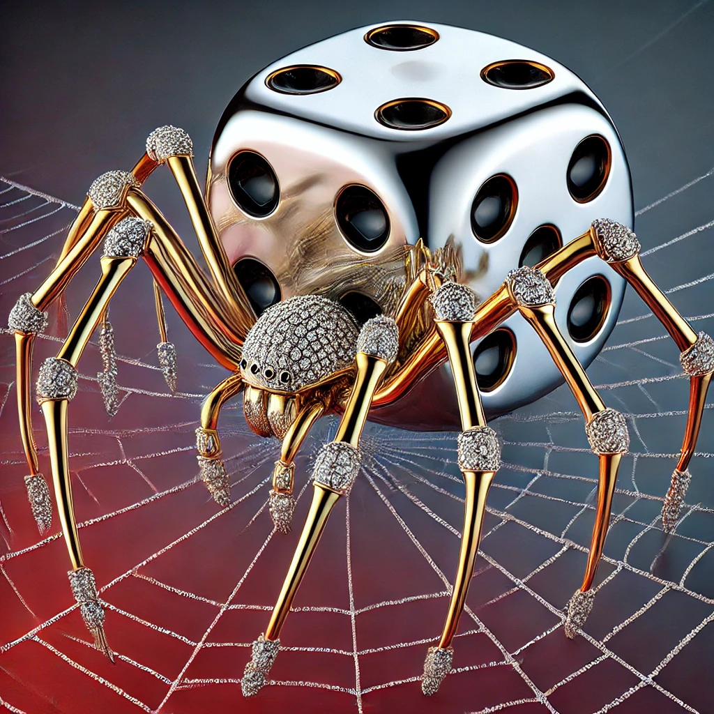 아름다운 거미를 그려줘. 몸은 은색 주사위, 주사위 눈은 검정색, 다리는 가늘고 긴 금색 거미다리, 거미의 눈은 반짝이는 다이아몬드. 붉은 거미줄위에 보석을 쥐고 있는 거미