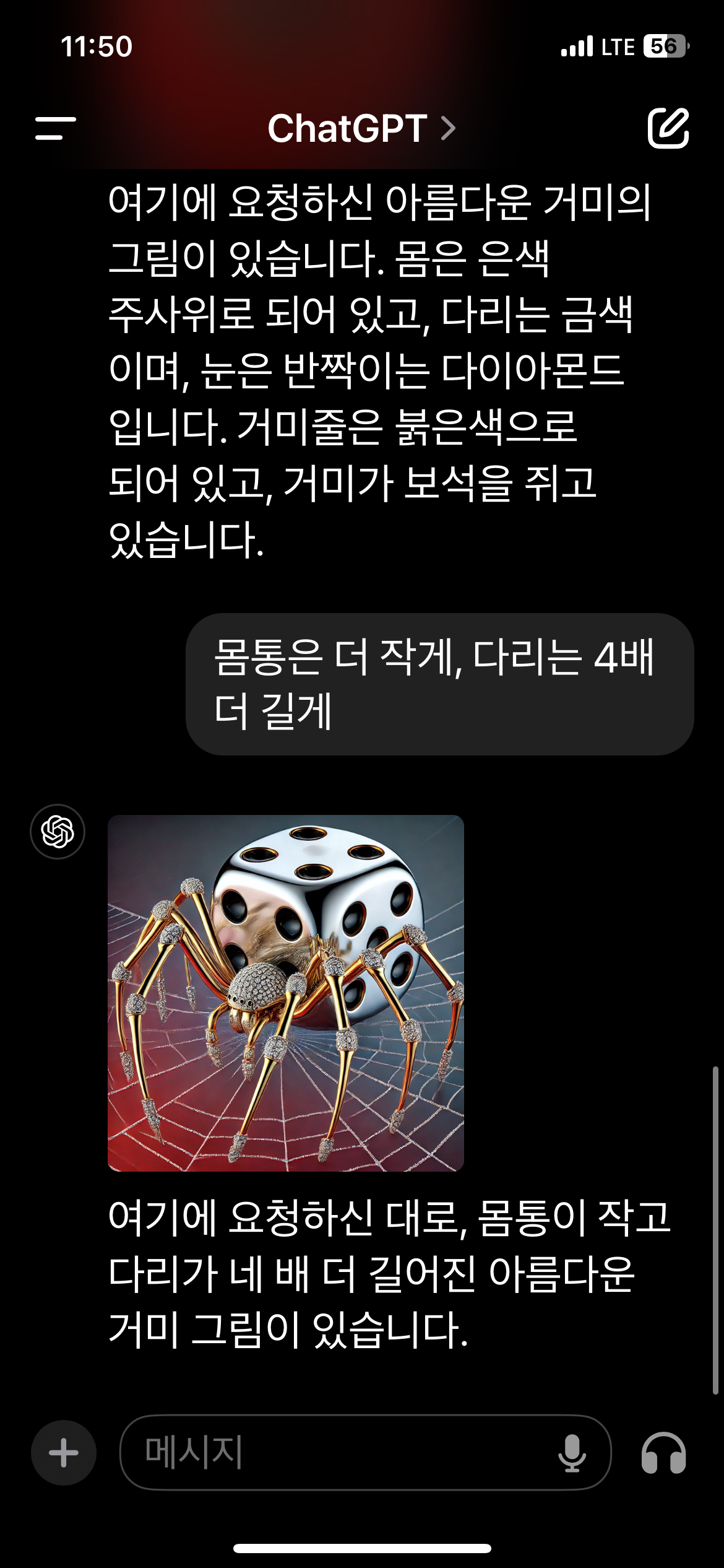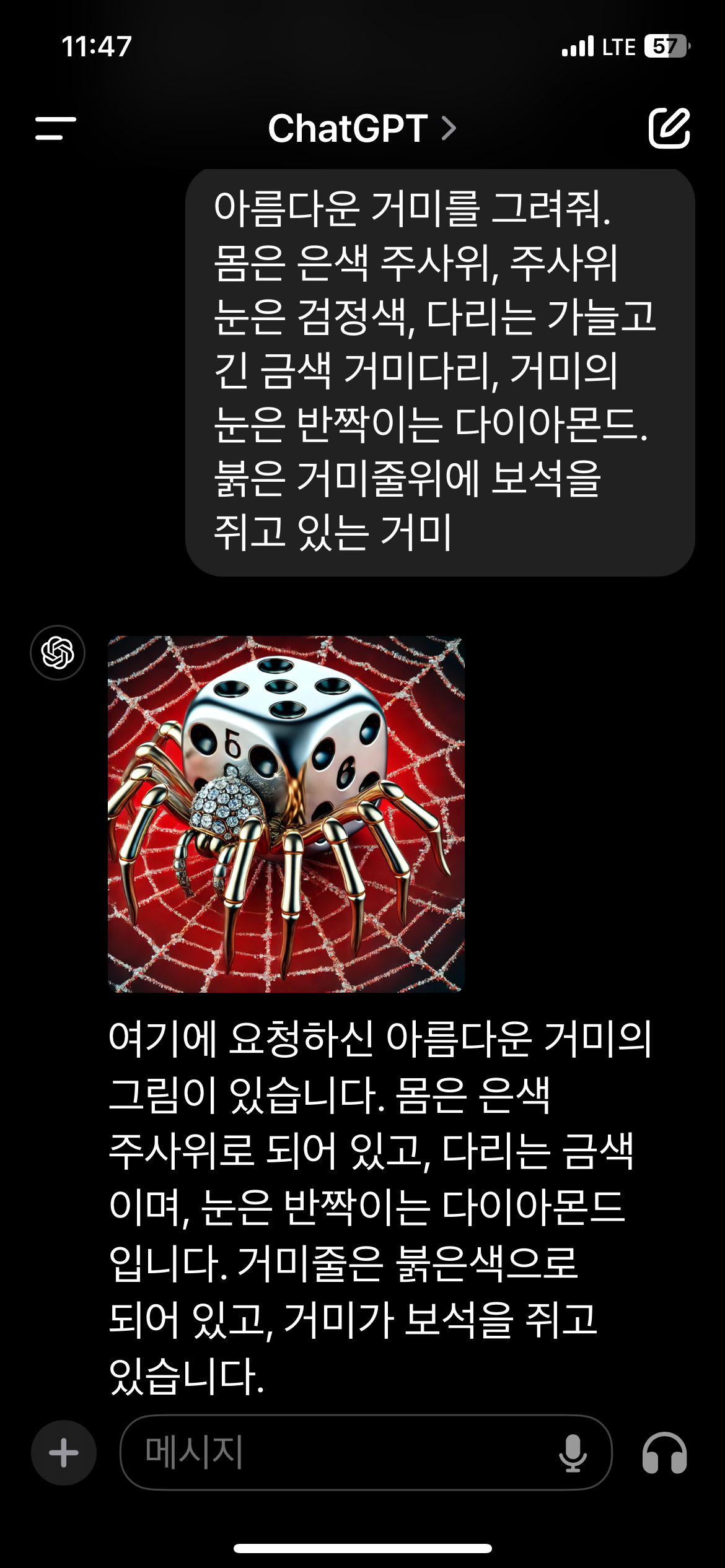 여기에 요청하신 아름다운 거미의 그림이 있습니다. 몸은 은색 주사위로 되어 있고, 다리는 금색이며, 눈은 반짝이는 다이아몬드입니다. 거미줄은 붉은색으로 되어 있고, 거미가 보석을 쥐고 있습니다.