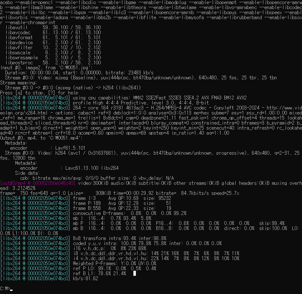 위에서 만들어진 JPG 이미지 파일 리스트를 mp4로 만드는 명령어