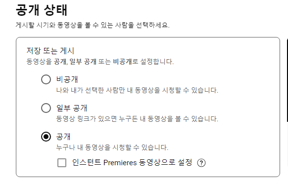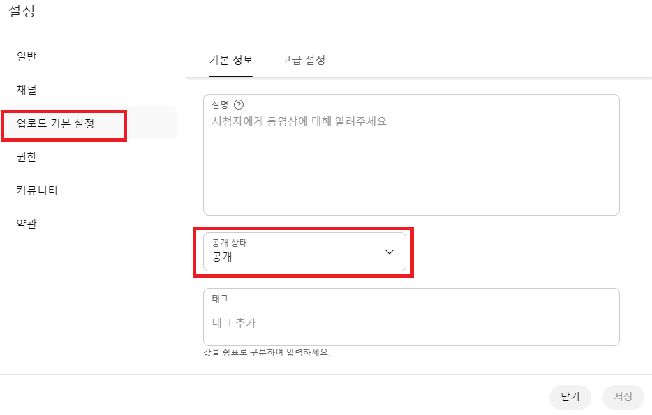 업로드 기본 설정에서 공개 상태를 공개로 변경하고 저장하면 공개 설정은 기본 공개로 설정되어 업로드시 클릭만으로 바로 다음 화면으로 넘어 갈 수 있다.