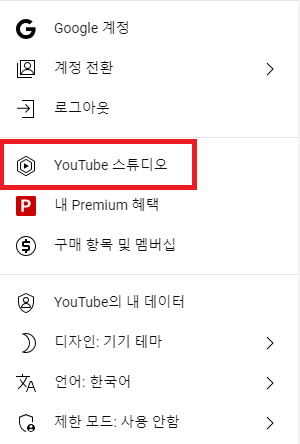 YOUTUBE 유튜브 기본 화면에서 오른쪽 상단에 아이디 이니셜을 클릭하고 YouTube 스튜디오를 클릭한다.