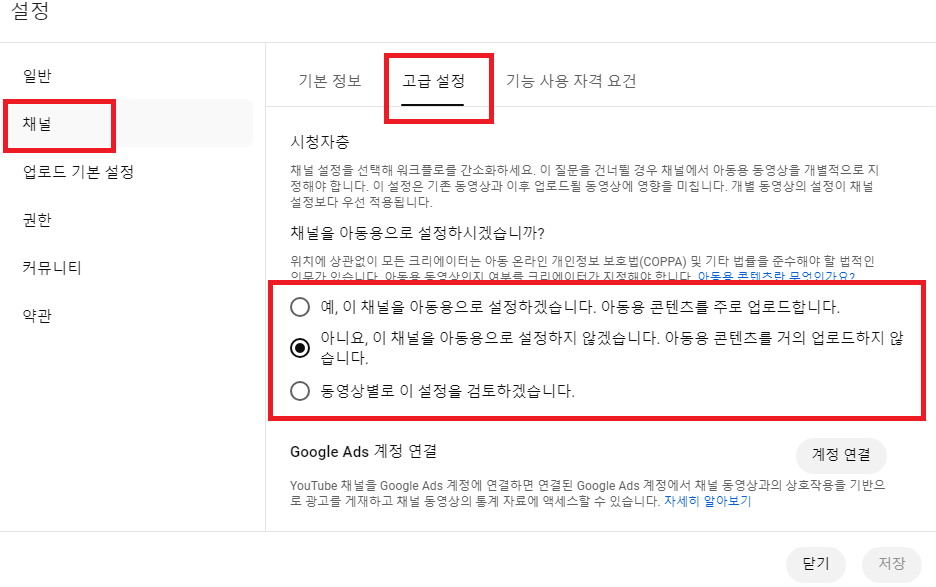 예, 이 채널을 아동용으로 설정하겠습니다. 아동용 콘텐츠를 주로 업로드 합니다.
