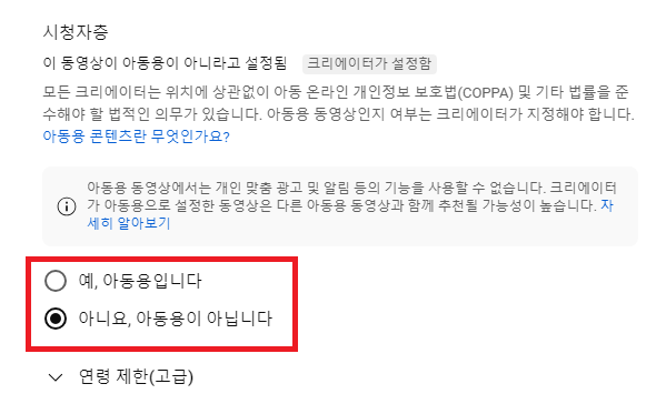 옵션 셋팅으로 예, 아동용입니다. 또는 아니요, 아동용이 아닙니다 를 선택 할 수 있다.