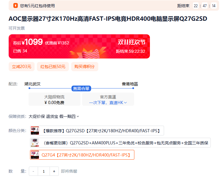 지금 타오바오 스펙에서 보면 hz가 180hz 로 판매된다. 아마도 패널이 변경된듯 하다.