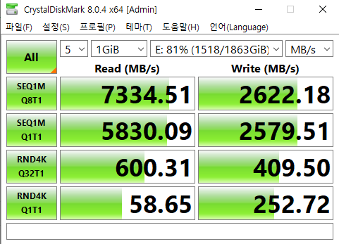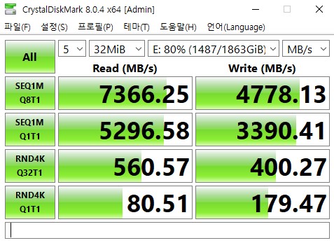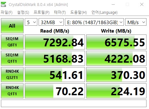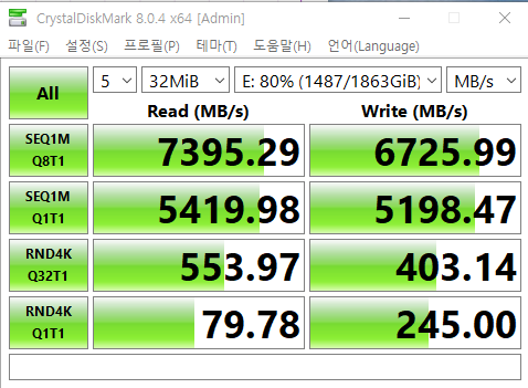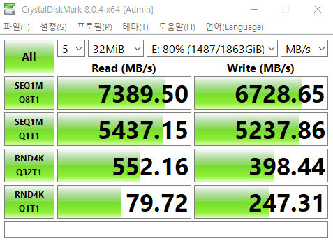 역시나 쓰기 속도가 7000에 가깝게 나왔다. SSD 사용량이 80% 넘어가는 상황에서 연속으로 7000 가까이 나온건 이번이 처음이다.