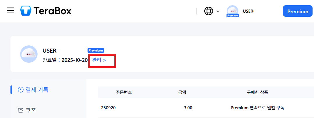 왼쪽 프리미엄 아래 "관리 >" 글귀가 사라졌고, 오른쪽에 Premium 요금 연장 버튼이 생겼다.