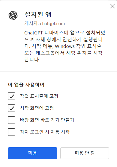 허용 하면, 작업표시줄에 아이콘으로도 만들수 있고 실행시 앱 모양의 창으로 열린다.
