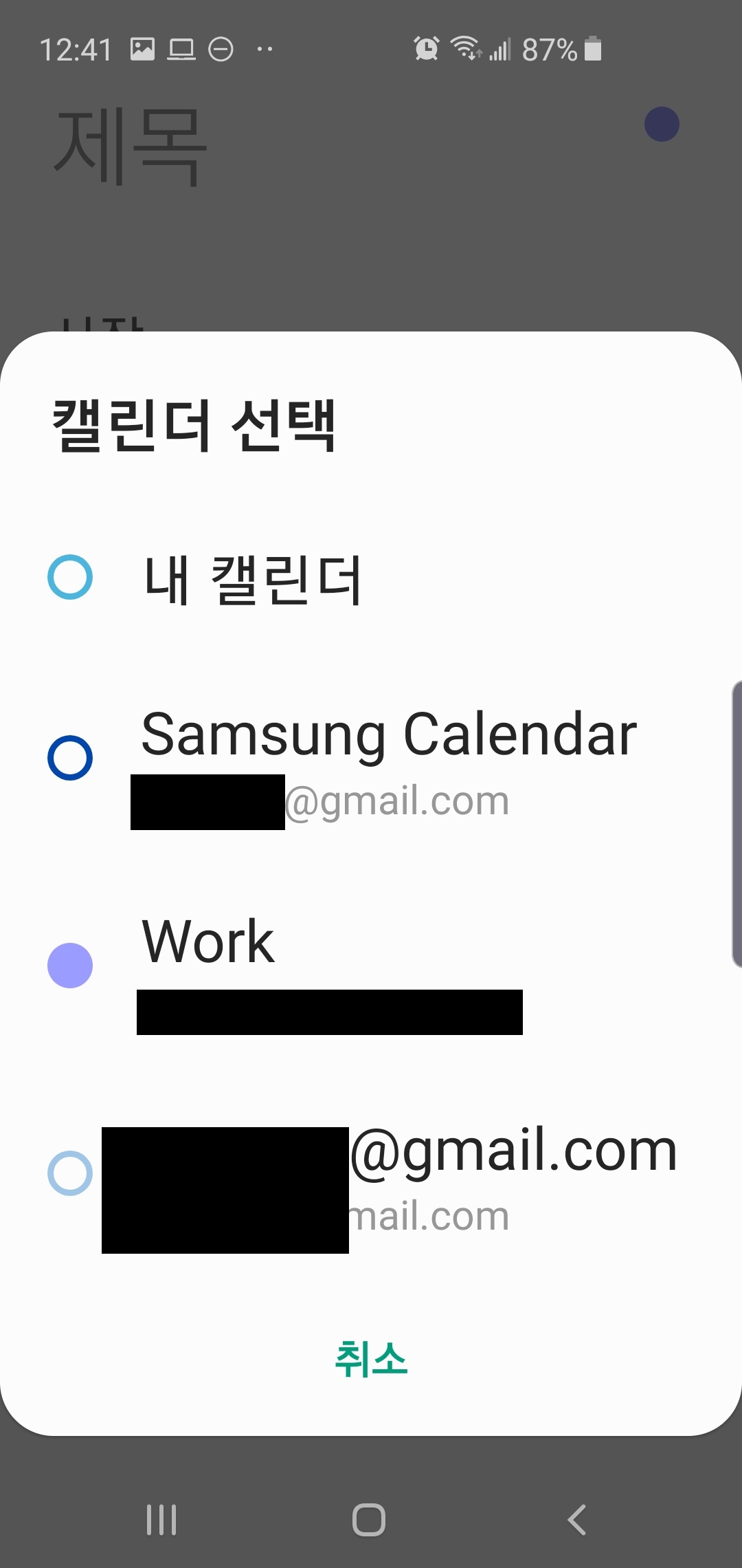 저장 위치를 삼성 계정이나 폰 자체 저장이 아닌 구글 캘린더 분류중에서 고르면 지원 지는 문제를 해결 가능하다.