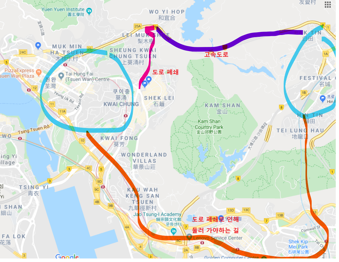 지금 사진에 폐쇠한 도로는 홍콩 북서쪽과 북동쪽을 잊는 도로다. 대부분의 버스는 이길로 두 지역을 연결하고 있고 가운데는 산이다. 산중간에 싱문 버스 터미널이 있고 여기는 버스 환승 하는 곳이 있는데 이곳에서 홍콩 대부분의 지역으로 가는 버스가 온다.
