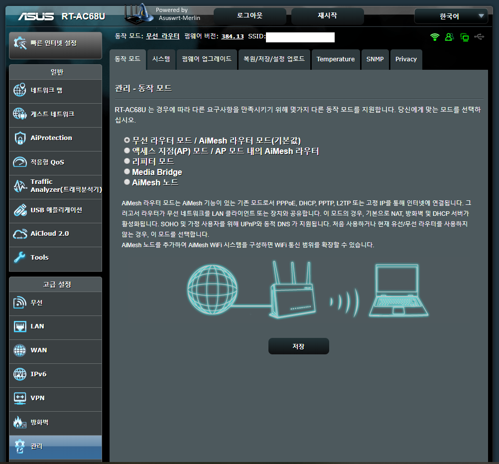처음 부터 멀리 깔려서 왔고 어제 오랫만에 최신 펌업으로 했다. 근데 정식 펌웨어는 Aimesh 노드 매쉬 모드 지원하는게 장점이라 정식으로 가려고 노력했지만 실력 부족으로 정펌으로 가는데 실패했다.