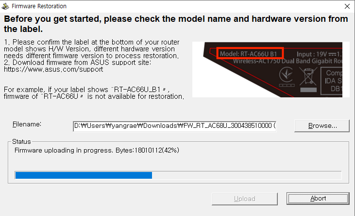 인터넷을 검색해서 커펌중 최하 버전을 받는다. asus 홈페이지에서 받을 수 있는 오래된 버전도 rescue로 업로드 못한다.