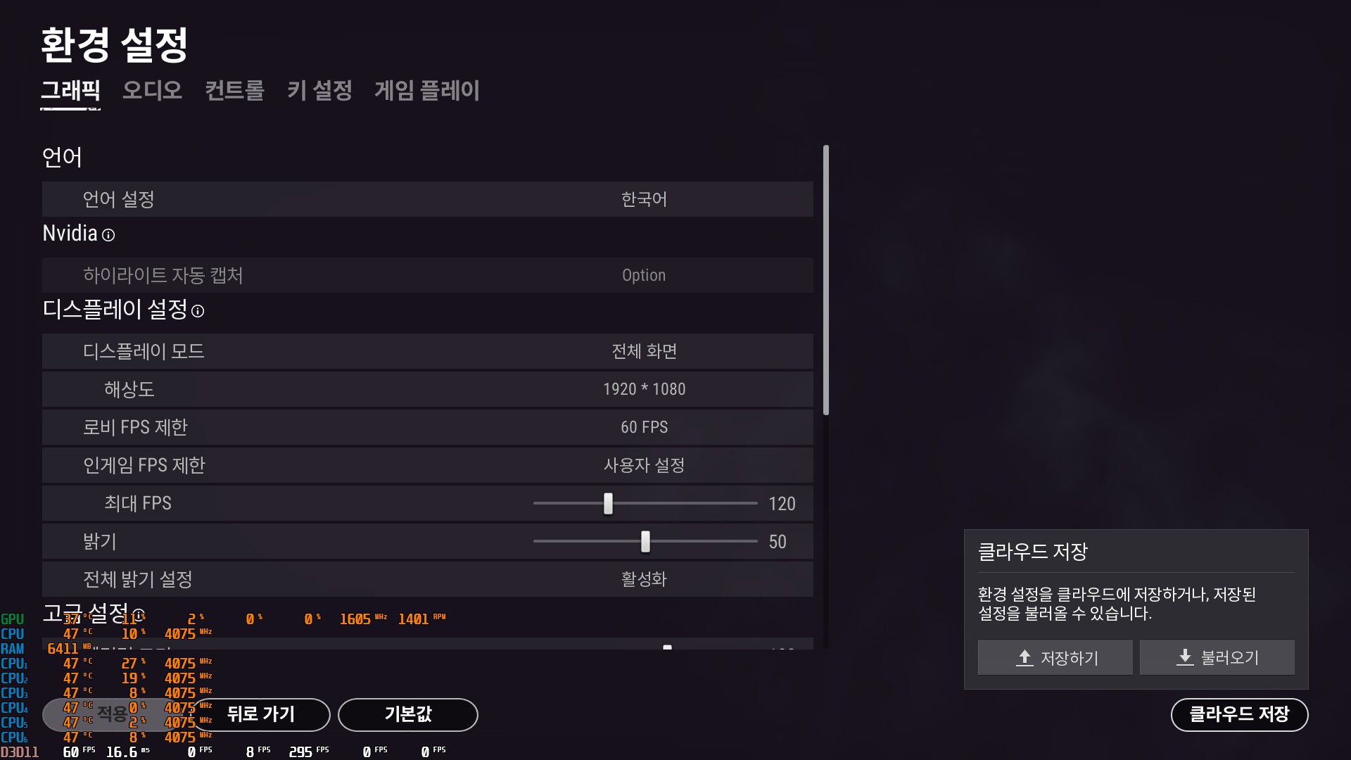 저장하기하면 지금 환경설정을 클라우드에 저장하고 불러오기하면 내려 받는다.