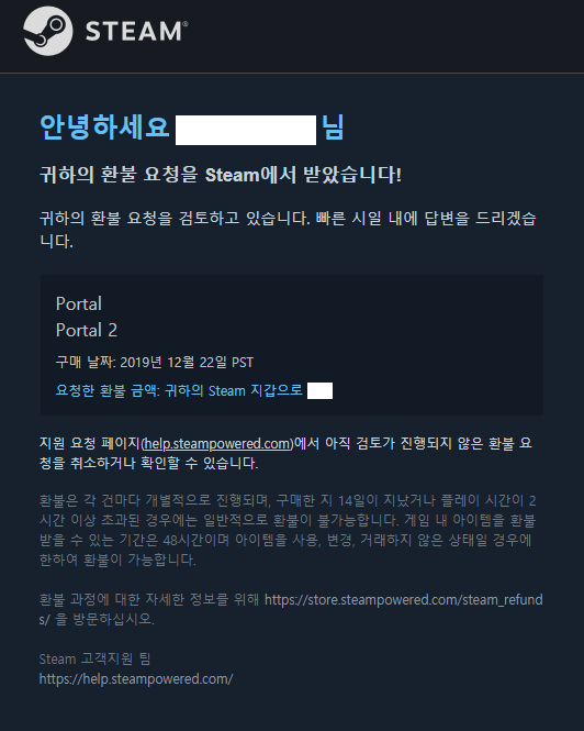 귀하의 환불 요청을 Steam에서 받았습니다!