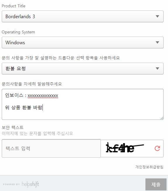 거기에 환불신청 폼을 완성하고 게임을 구매할때 메일로 받았던 상품의 인보이스 번호를 입력하고 환불 요청한다고 하면 끝이다.