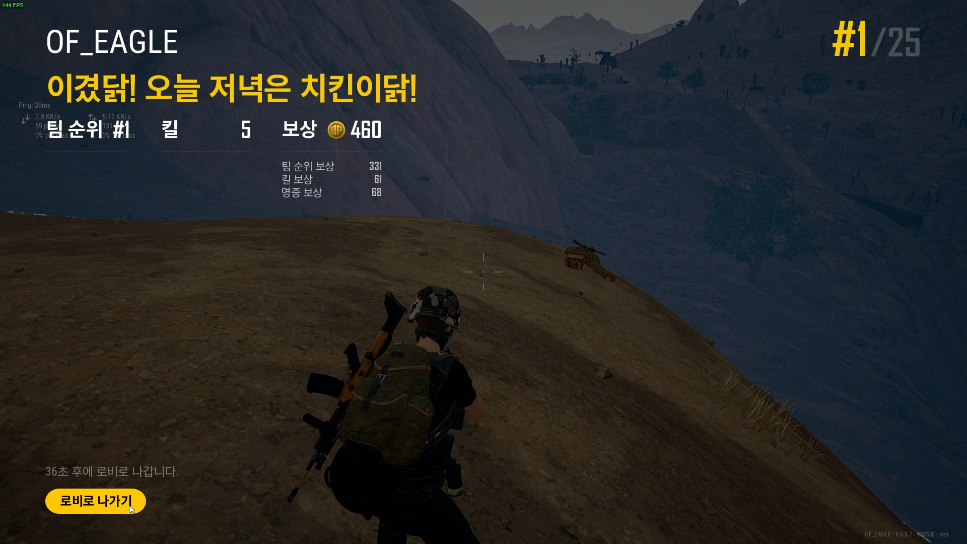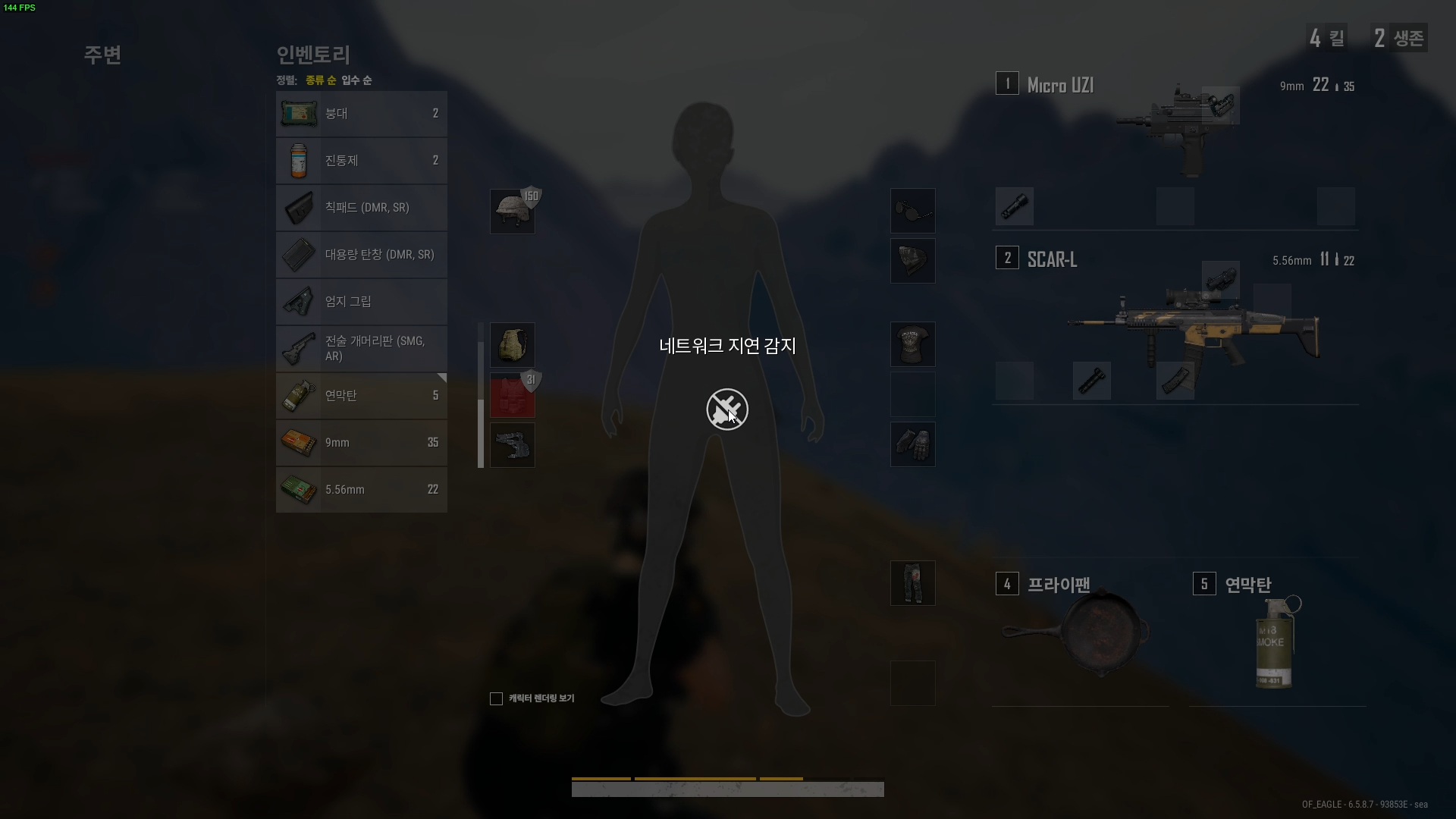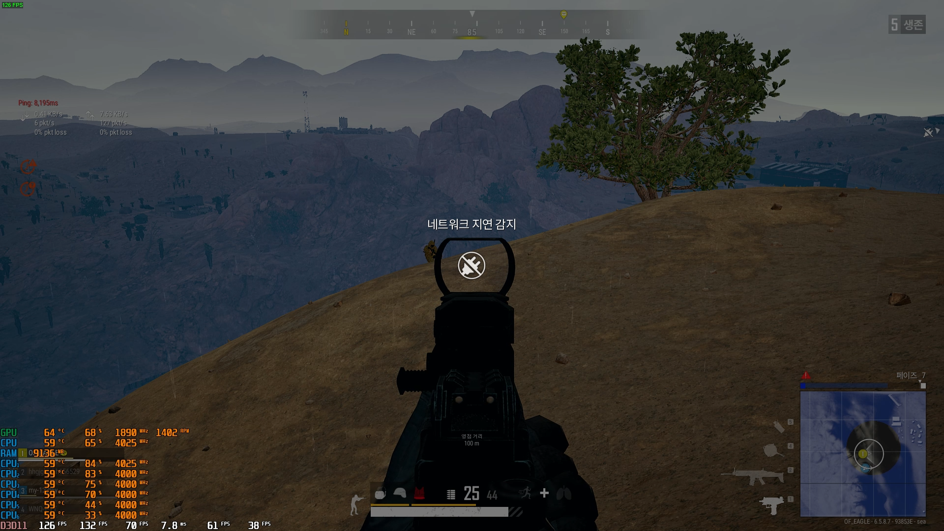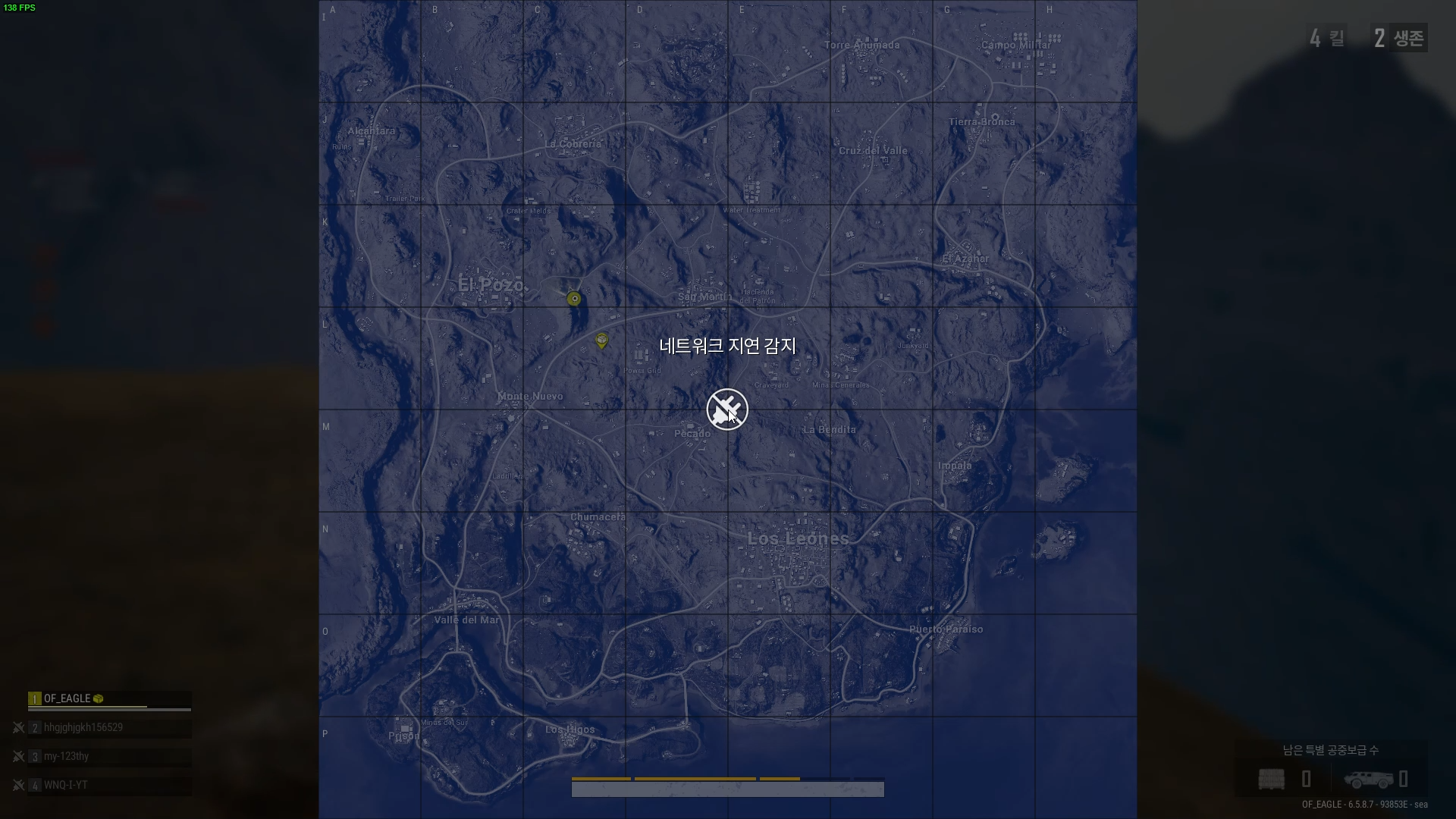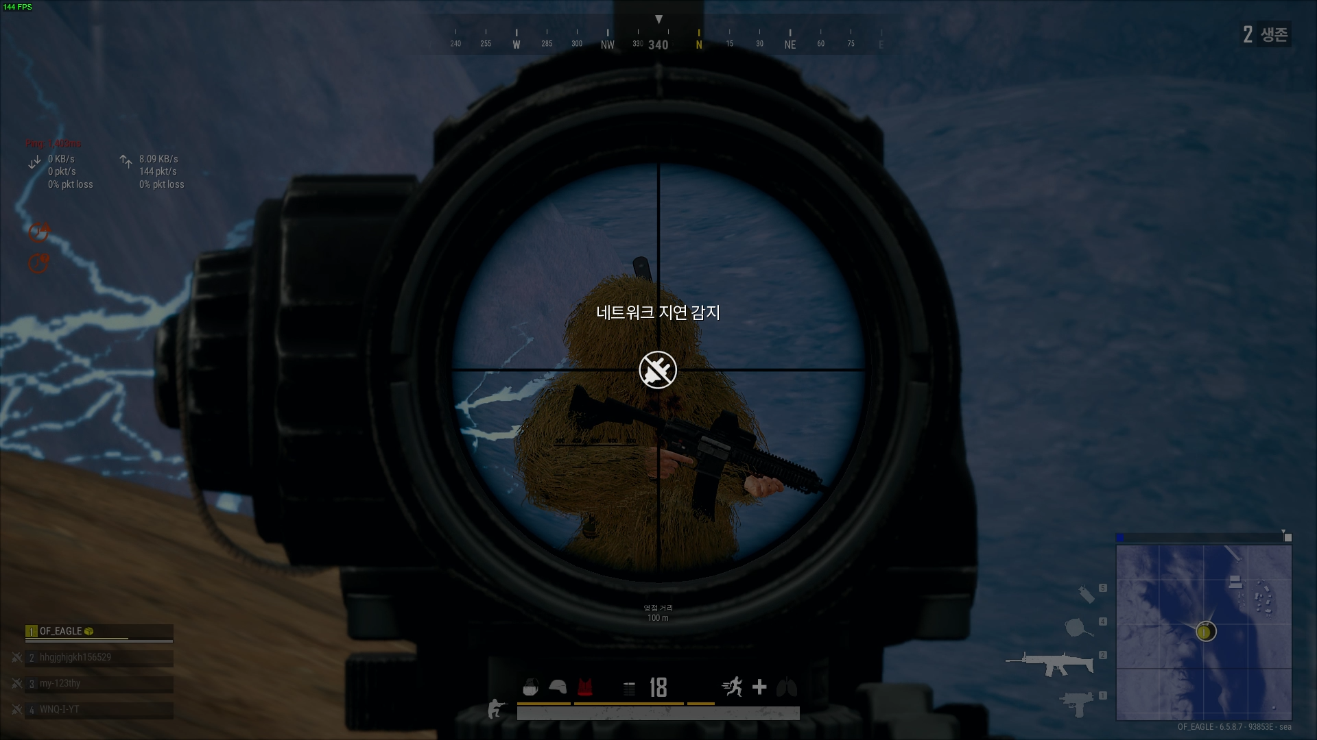 10명 남아 있었는데 갑자기 네트워크 지연 감지가 뜨기 시작했다. 잠시후 적과 내가 뒤엉켜 게걸음 치고 있었는데 2~3분 네트워크 지연 감지 상태를 유지하다 1초식 풀렸다. 그때 적도 쏴보고 했지만 데미지가 안들어간다.