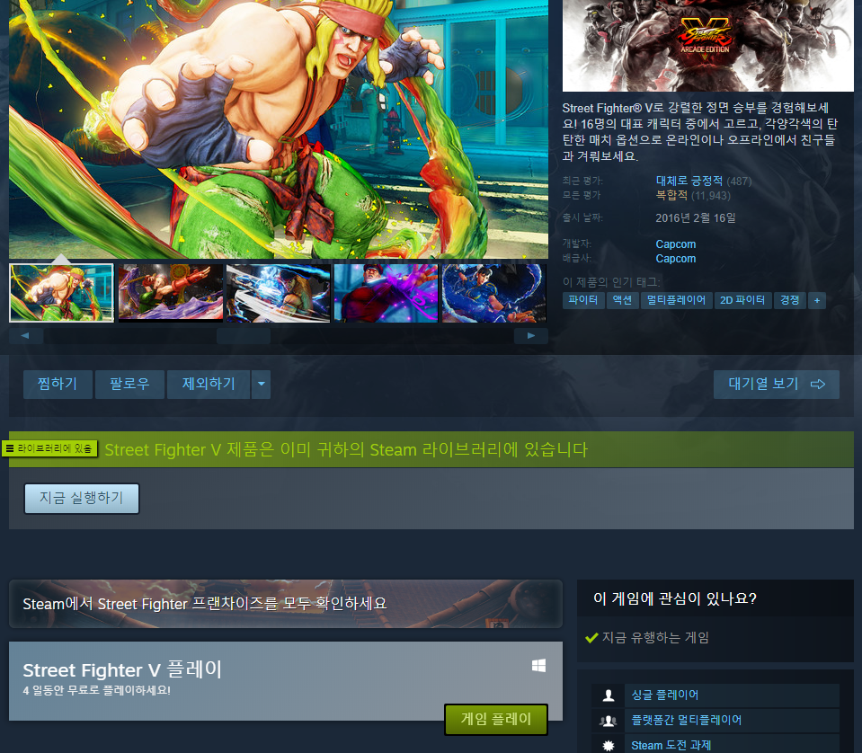 스팀에 접속해서 STREET FIGHTER 를 검색하고 V 를 선택하면 무료 플레이 가능하다.