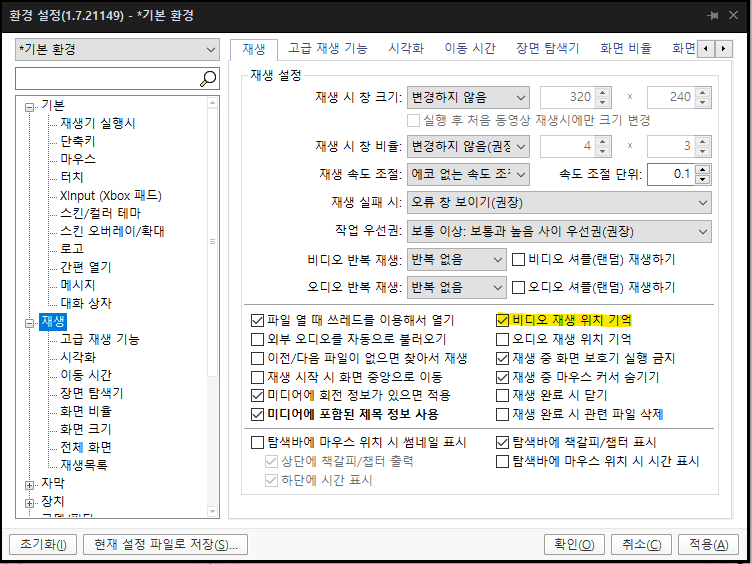 환경 설정 > 재생 > 노란색의 비디오 재생 위치 기억 을 체크해두면 나중에 보던 영상 보던 위치에서 이어서 계속 볼수 있다.