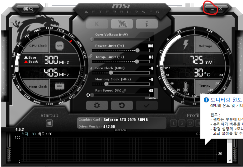 에프터버너를 닫을 때는 반드시 최소화면 _ 을 눌려서 닫아야 한다. x 를 눌려 종료 시켜 버리면 모니터링이 안된다.