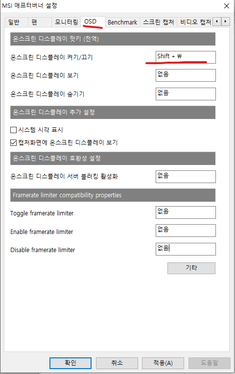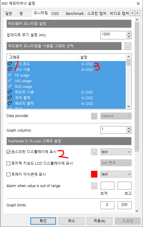 2라고 쓰여진 온스크린 디르플레이에 표시를 체크하면 3이라고 쓴 in OSD 라는 글자가 나온다.