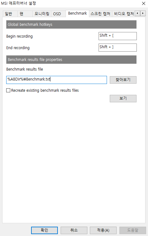 Benchmark 에서 begin recoding은 shift +[ 그리고 End recording은 shift +] 로설정했다.