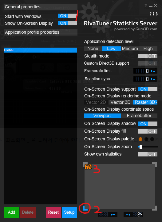 표시되는 위치를 바꾸고 싶다면 게임 화면 위에 리바튜너를 불러 위치를 바꾸면 실시간으로 게임상에 표시되는 위치를 변경이 가능하다.