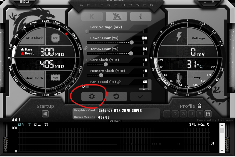 에프터버너를 실행후 가운데 톱니봐퀴 설정 메뉴를 연다.