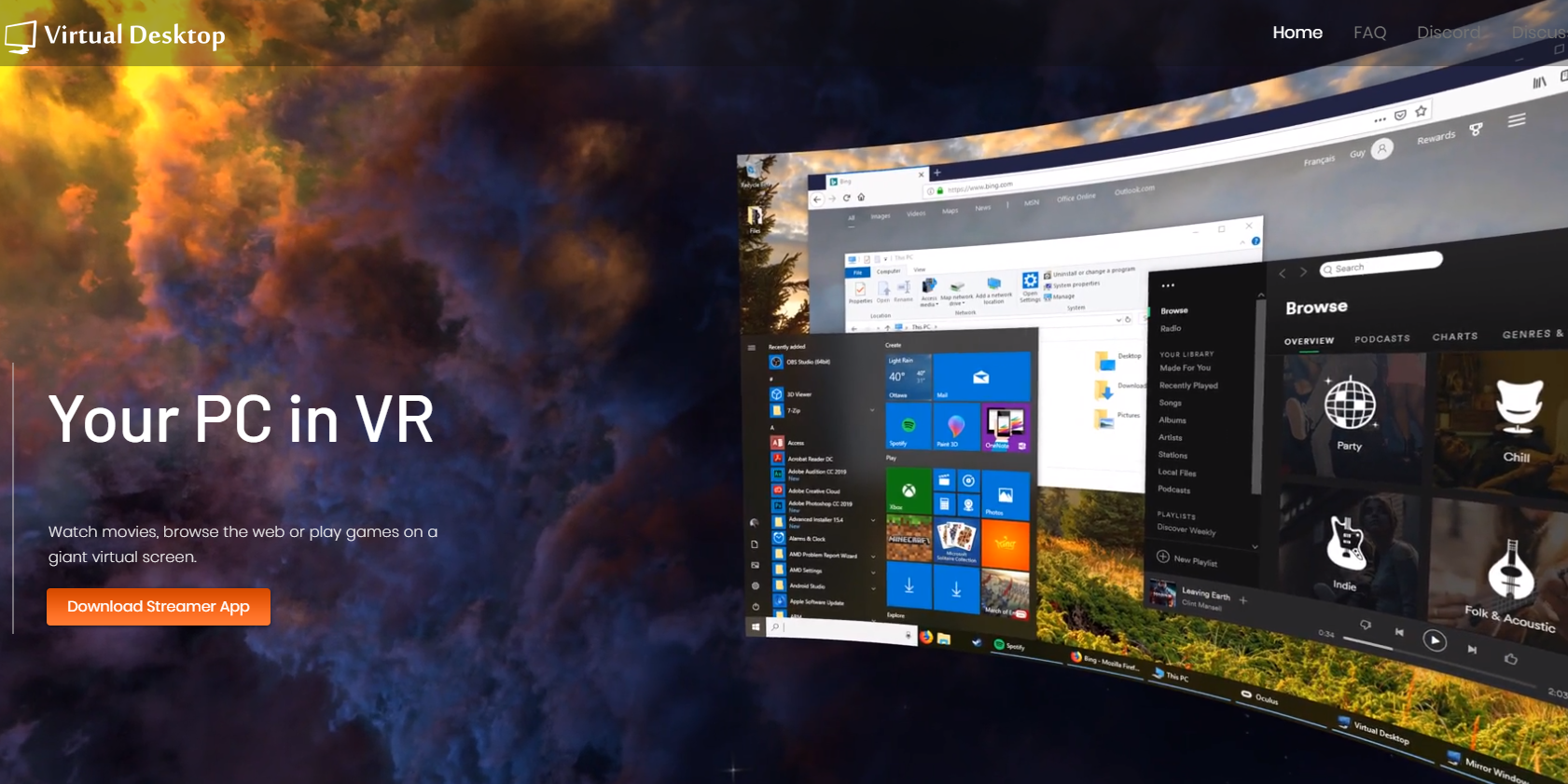 PC화면에서 스팀VR을 실행시키든, 버추얼데스크탑 서브 메뉴(왼쪽 엄지 메뉴 버튼을 길게 눌려 오픈) 를 열어 GAMES 옵션에서 게임실행을 하면 화면에 오큘러스 프로그램을 깔라는 팝업 메시지가 뜨는데 클릭하면 바로 오큘러스 홈페이지로 이동하고 거기서 다운 받아 설치가능하다.