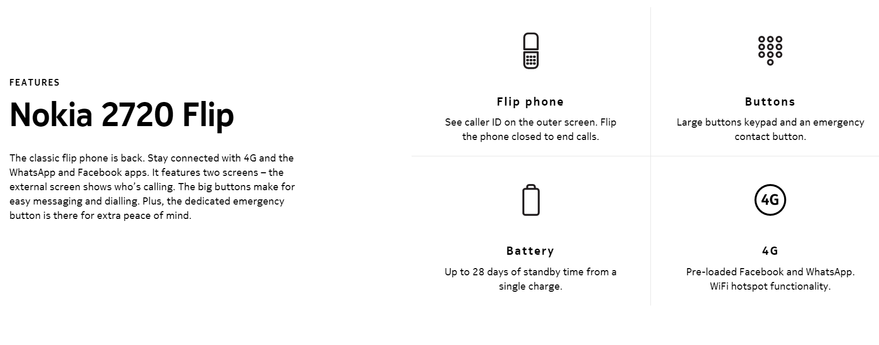 메뉴 : 영어 입력 : 한글 천지인 자판 : 영어 및 기타 (한글 인쇄 없음) 듀얼심 2G, 3G, 4G LTE 클래식 플립 폰이 돌아 왔습니다. 4G 및 WhatsApp 및 Facebook 앱과 연결 상태를 유지하십시오. 두 개의 화면이 있습니다. 외부 화면은 누가 전화했는지를 보여줍니다. 큰 버튼으로 쉽게 전화를 걸고 전화를 걸 수 있습니다. 또한 전용 비상 버튼이있어 더욱 안심할 수 있습니다.