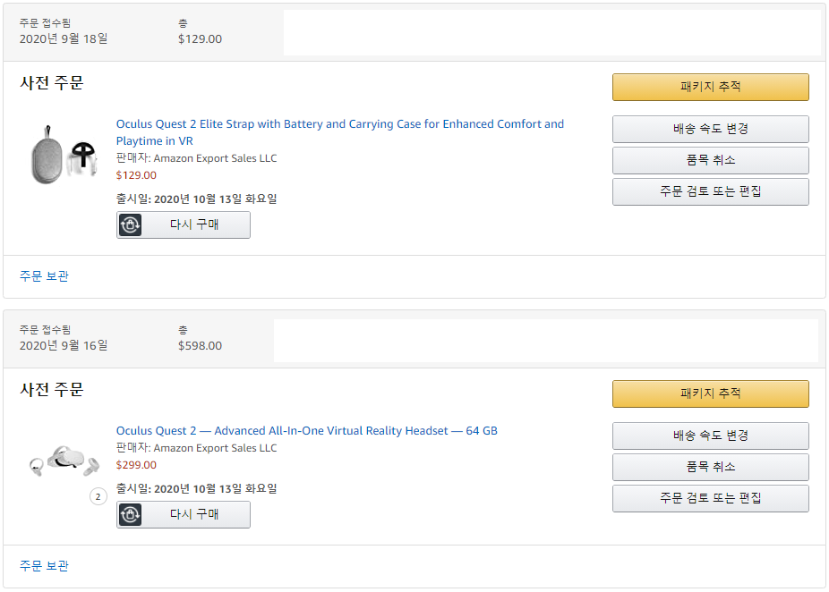 나는 오큘러스 홈페이지가 아닌 아마존에서 구매했다. 아마존 셀러고 무료배송이고 관부세가 빠져서 조금 더 저렴하다.