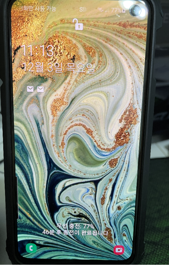 갤럭시 S10E 77%에서 완충하는데 46분 정도 예상 완충 시간이 나왔다.
