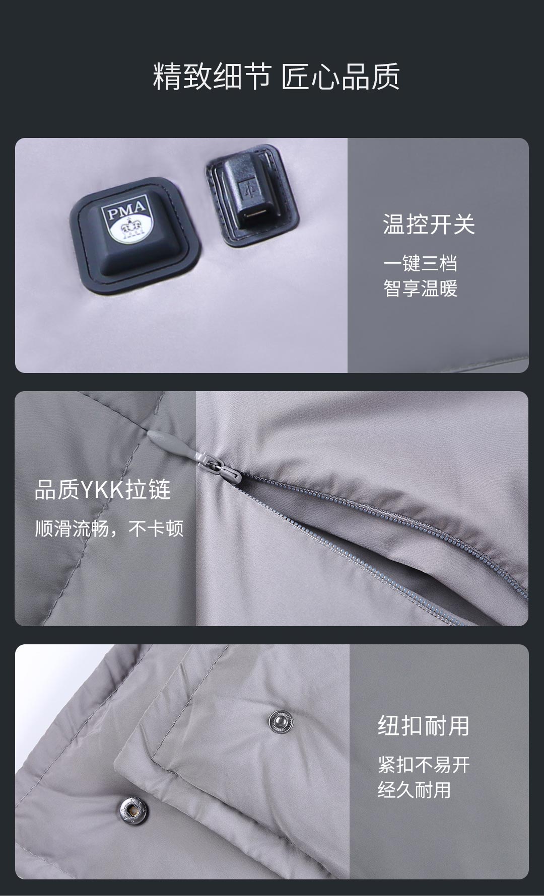 USB와 연결하면 콘트롤러 부분에 빨강, 파랑, 초록 불이 깜빡인다. 버튼을 누르고 3초 정도면 고온으로 켜진다 한번 더 누느면 중온, 거기서 한번 더 누르면 저온으로 낮아진다. 얇은 옷이라면 저온이어야 사용할만하고 고온이면 뜨겁다. 발열소자가 있는 부분만 뜨겁고 나머지 부분은 시릴수 있으니 되도록 두꺼운 옷이나 천을 덥고 사용하는 것이 좋다.