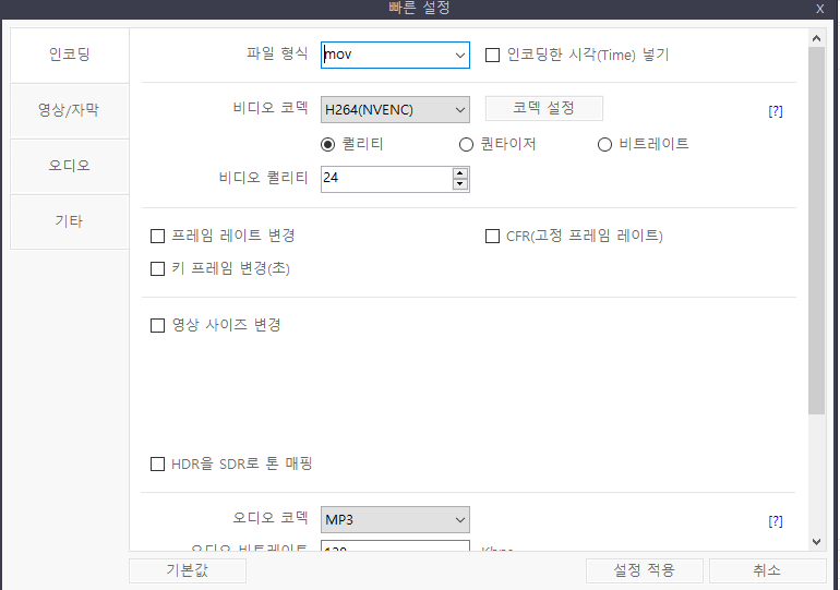 내장 그래픽이라면 CPU를 사용하는게 나을 것이고 고성능 그래픽 카드라면 그래픽 카드로 인코딩 해주는게 빠르다.