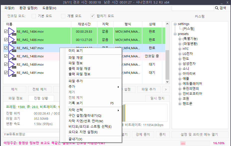 동영상 포멧 변환을 위한 인코딩, 간단한 영상 자르기, 여러 동영상 합치기에 샤나인코더가 사용하기 편하고 오류도 없어 만족스럽다.