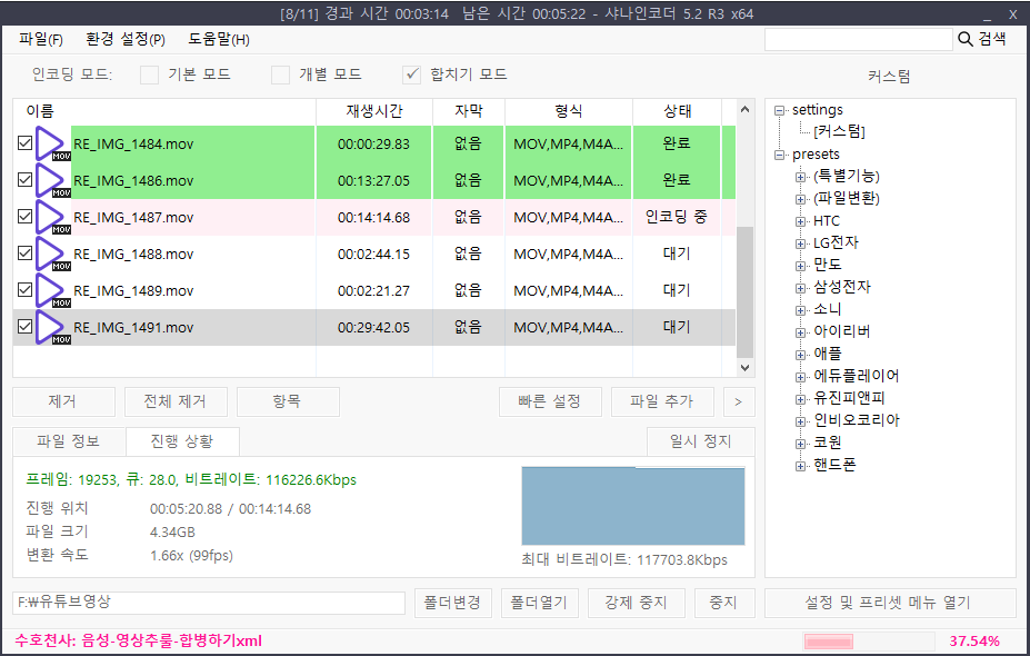 처음 설정없이 인코딩 할때 속도가 0.6x 정도 나왔는데 그래픽카드 가속할 수 있게 설정하니 1.66x(99fps) 까지 올라 갔다. 약 2배 정도 빨리지는 효과를 얻었다.