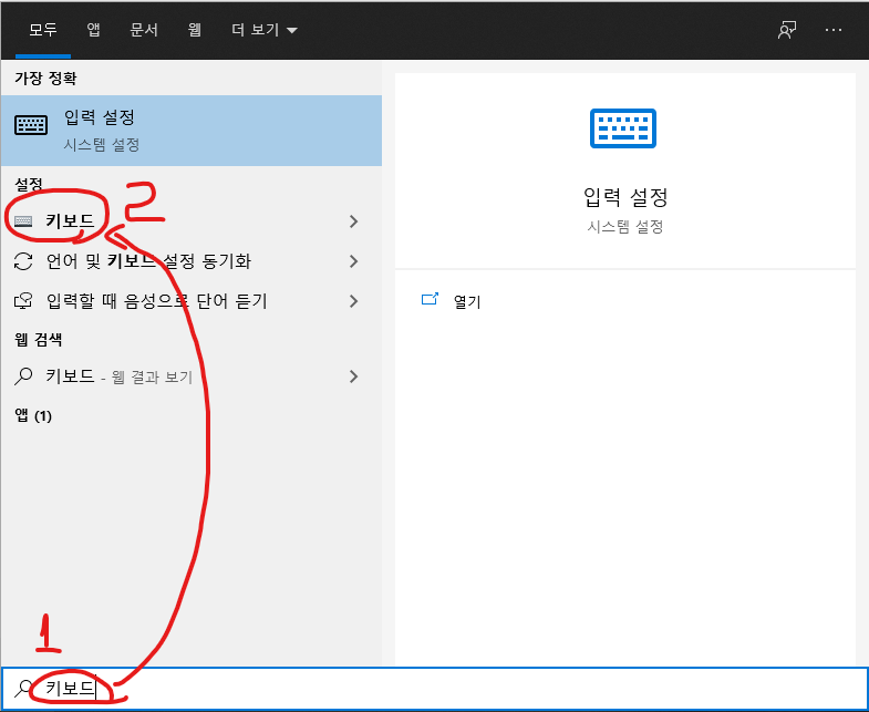 윈도우10 검색에서 "키보드"라고 입력하면 아래와 같은 기능이 나온다.