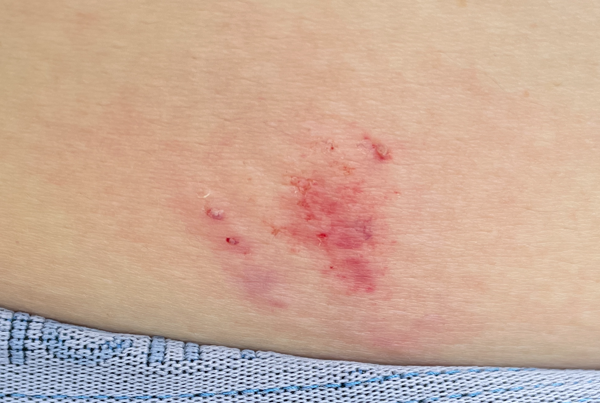 티셔츠를 올려 확인했더니 살짝 긁힌 자국이 있었다. 시간이 지날 수록 통증이 와서 다시보니 서서히 붉어 지더니 멍든 듯 살짝 파랗게도 보였다.