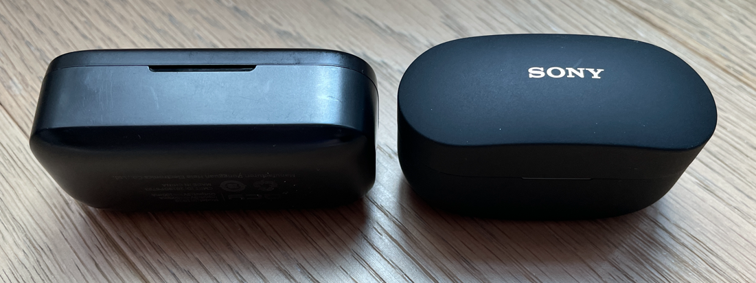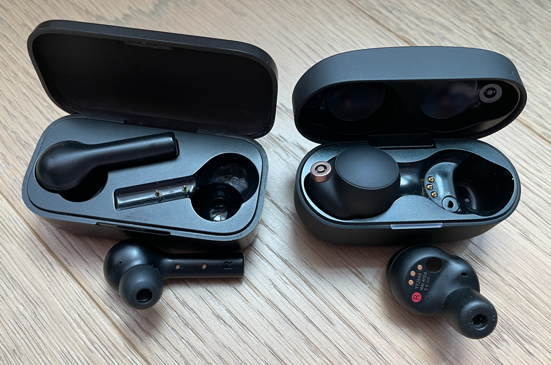 QCY 는 배터리가 다리쪽에 있고 1000XM4 는 배터리가 이어폰 유닛 쪽에 있어서 두꺼워 모양이 복어 같다.