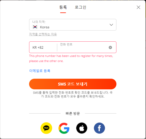 사용했던 번호로 다시 가입하려고 하니 위와 같이 해당 번호는 여러번 사용되었다. 다른 번호를 이용해라. 라는 메시지가 뜬다.